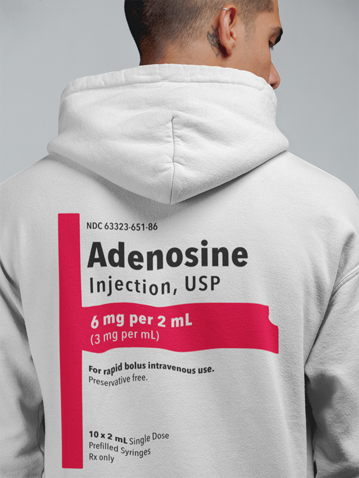 Questa hoodie unisex, con zip e cappuccio, calda e morbida al tatto è ispirata al farmaco “Adenosina”. La stampa è posta dorsalmente ed è di ottima qualità, i colori rimarranno brillanti e duraturi anche dopo molti lavaggi in lavatrice. Ultima chicca: puoi personalizzare questo prodotto aggiungendo una scritta frontalmente, lato cuore, di circa 10 cm.
