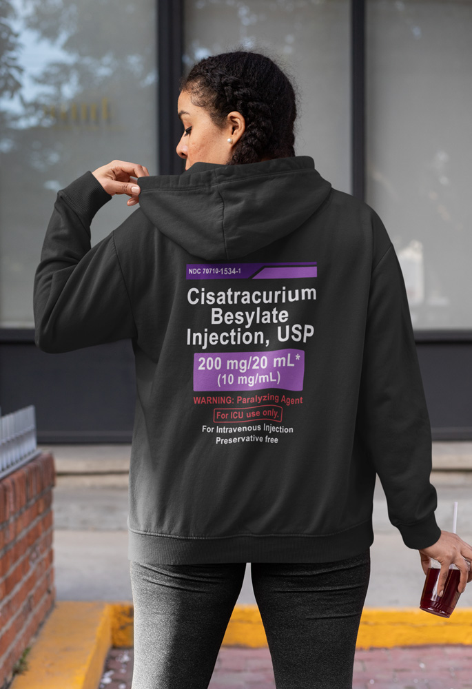 Questa hoodie unisex, con zip e cappuccio, calda e morbida al tatto è ispirata al farmaco “Cisatracurio”. La stampa è posta dorsalmente ed è di ottima qualità, i colori rimarranno brillanti e duraturi anche dopo molti lavaggi in lavatrice. Ultima chicca: puoi personalizzare questo prodotto aggiungendo una scritta frontalmente, lato cuore, di circa 10 cm.