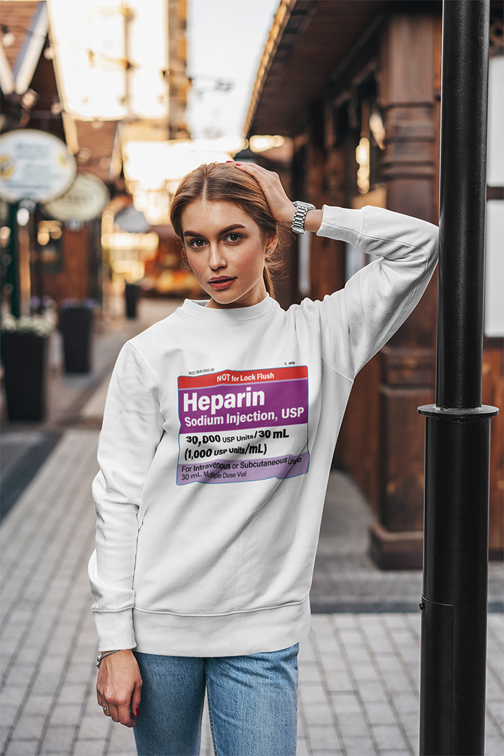 Questa felpa girocollo unisex, calda e morbida al tatto è ispirata al farmaco “Eparina”. La stampa DTG (Direct-to-Garnment) di alta qualità garantisce altissima tenuta nel tempo, saldando i colori nel tessuto così da rimanere brillanti e duraturi anche dopo molti lavaggi in lavatrice. Ultima chicca: questo prodotto può essere personalizzato aggiungendo una scritta a piacere sulle spalle.