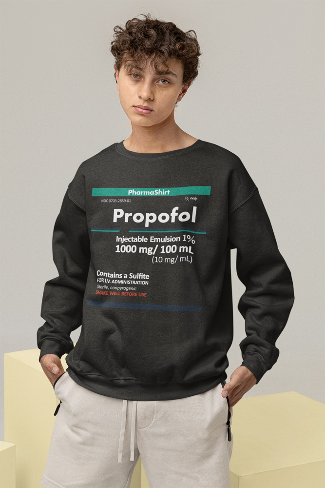 Questa felpa girocollo unisex, calda e morbida al tatto è ispirata al farmaco “Propofol”. La stampa DTG (Direct-to-Garnment) di alta qualità garantisce altissima tenuta nel tempo, saldando i colori nel tessuto così da rimanere brillanti e duraturi anche dopo molti lavaggi in lavatrice. Ultima chicca: questo prodotto può essere personalizzato aggiungendo una scritta a piacere sulle spalle.